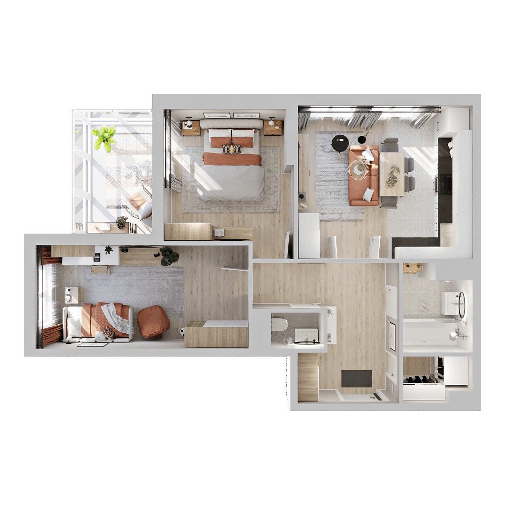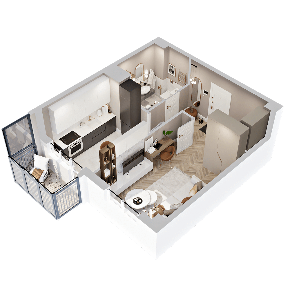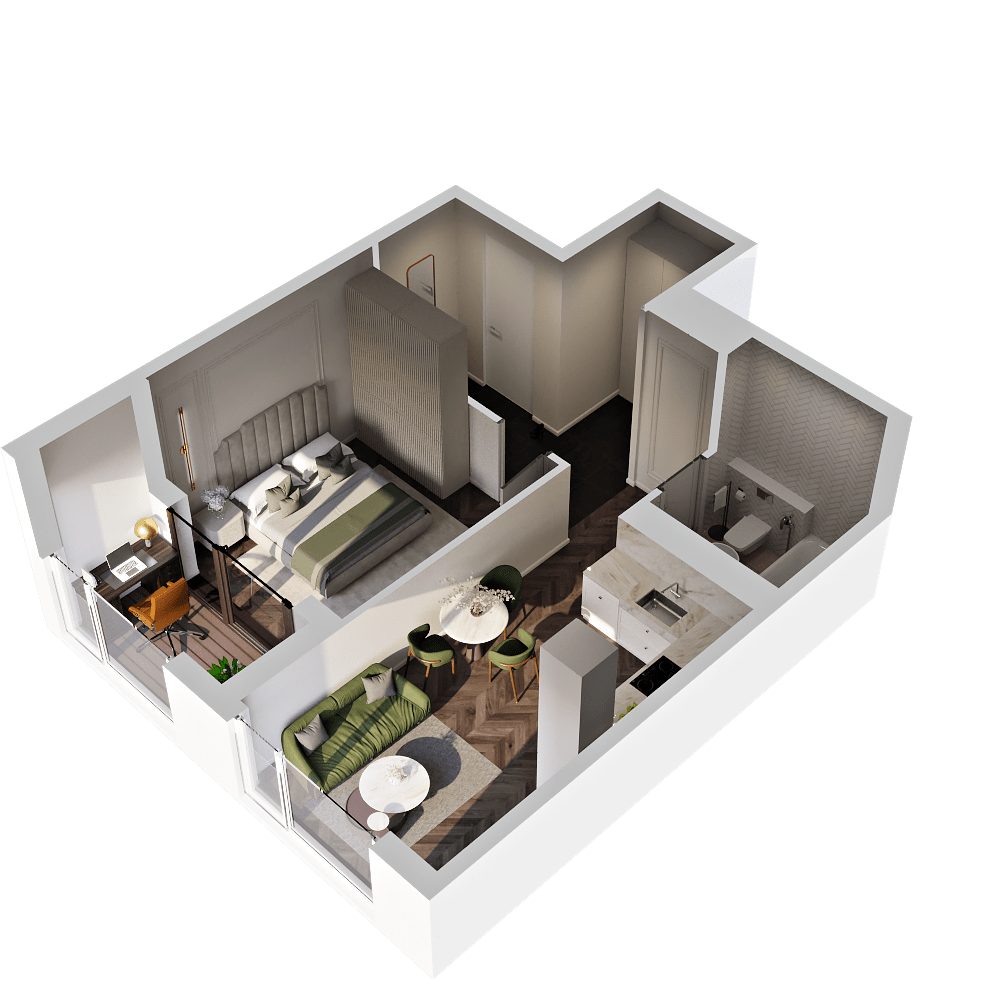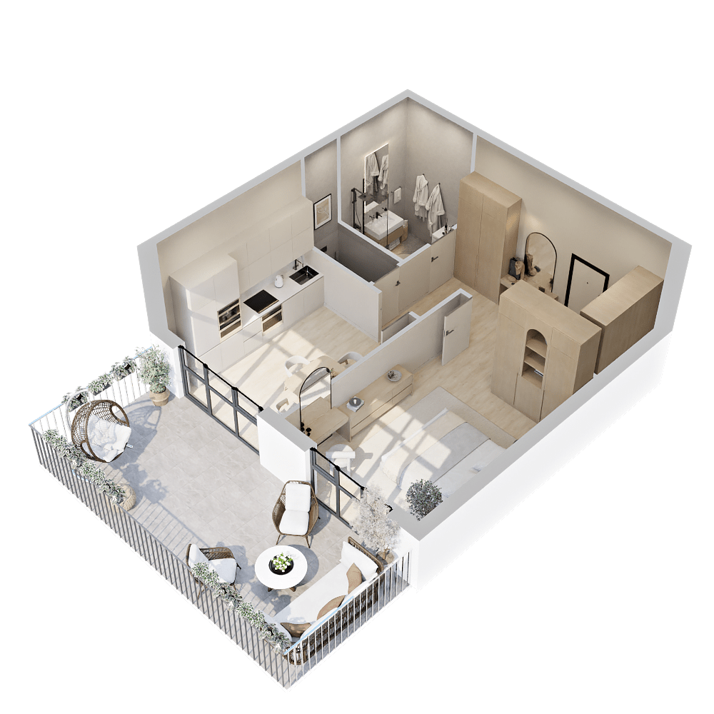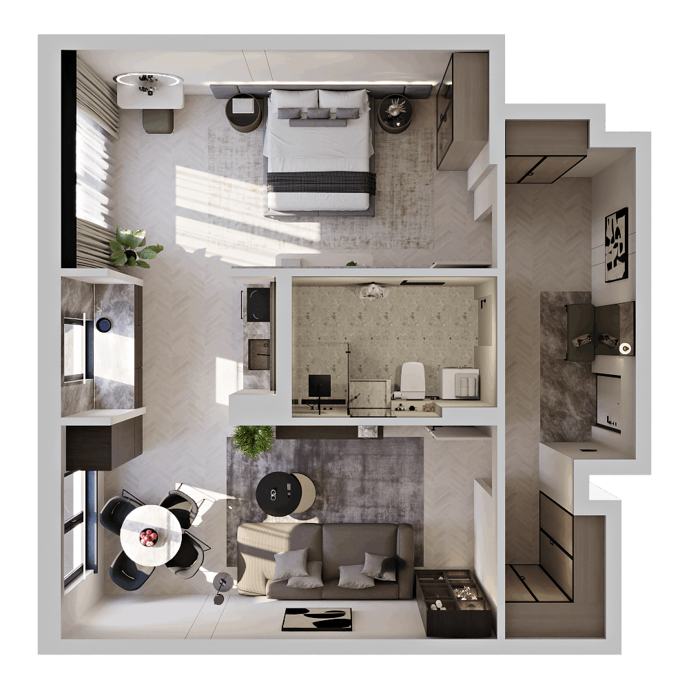 Стильные и атмосферные интерьерные рендеры с впечатляющей детализацией и реалистичностью. Они привлекут внимание покупателей и помогут представить себя в будущей квартире. Закажите создание интерьерных рендеров в пакете услуг и используйте их в своих буклетах, печатных материалах и на сайте жилого комплекса.