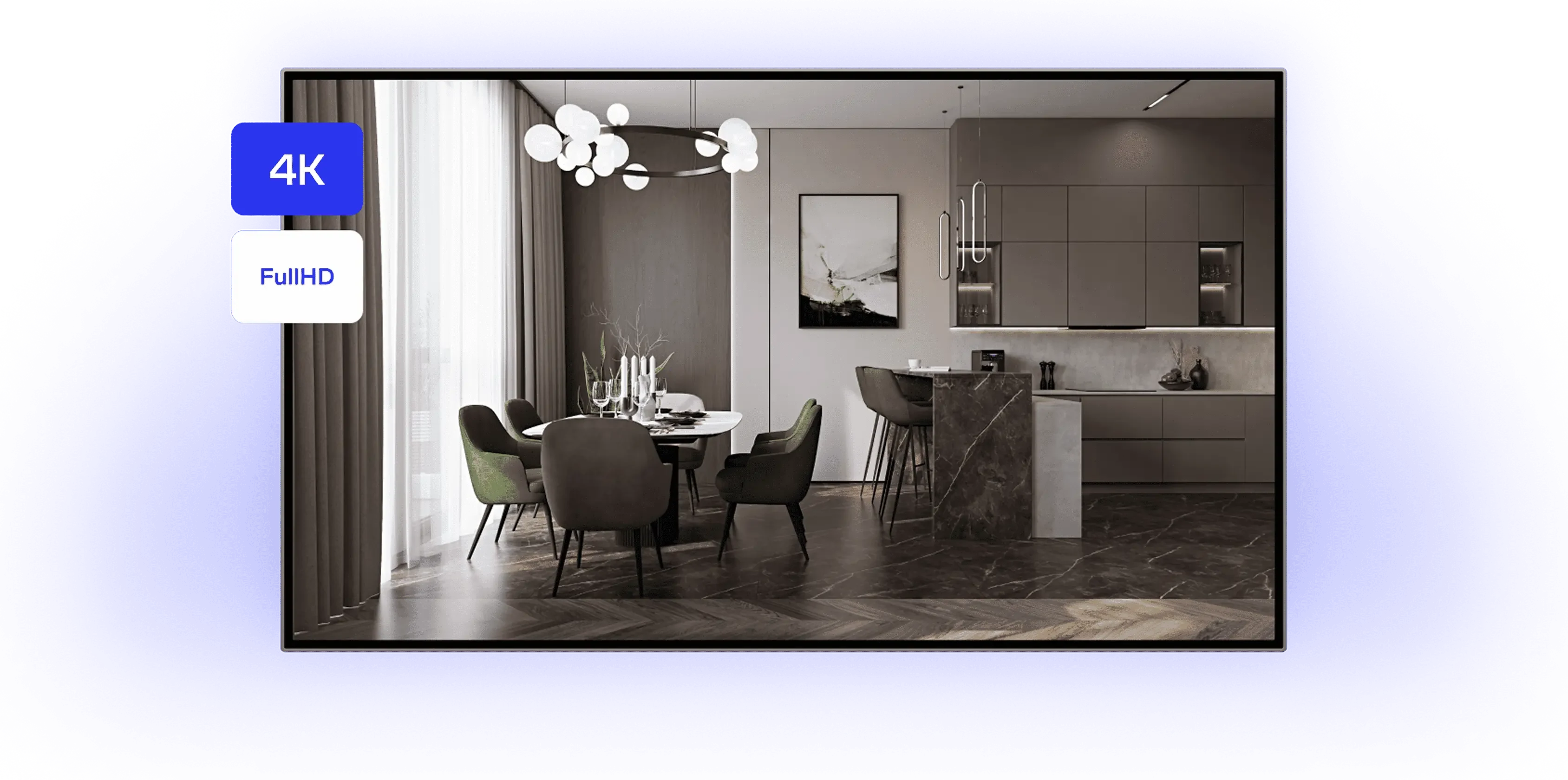 Теперь ещё больше реализма: мы перешли с формата FullHD на 4K, чтобы каждая деталь квартиры была видна в максимальном разрешении. Ваши клиенты заметят разницу — особенно на современных экранах своих устройств и презентационных дисплеях в офисе продаж.